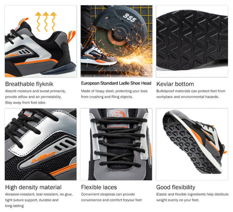 - Ultralight safety shoe: It is like the weight of a pair of running shoes. They can help you to work happily all day without exhausting your feet. With super soft insoles and High elastic sole. your feet are safe and comfortable. Flying knit upper is very soft. Keep your feet comfortable and breathable.