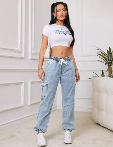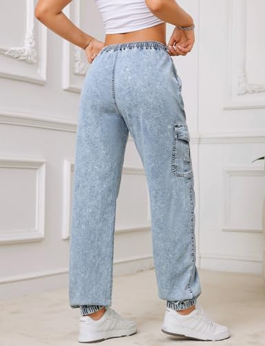 Jean Joggers for Women Elastic Waist Cargo Jeans Stretch Loose Baggy Denim Pants with Drawstring