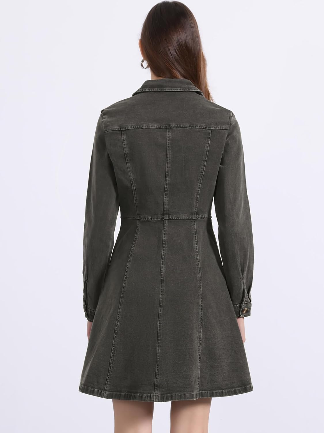 - This denim dress is fitted waist design, midweight fabric, so it’s recommended to Order One Size Large! Featured Cotton Blend Denim, Point Collar with V Neck, Button Down, Faux Chest Pockets, Long Sleeve, Mid-thigh Length