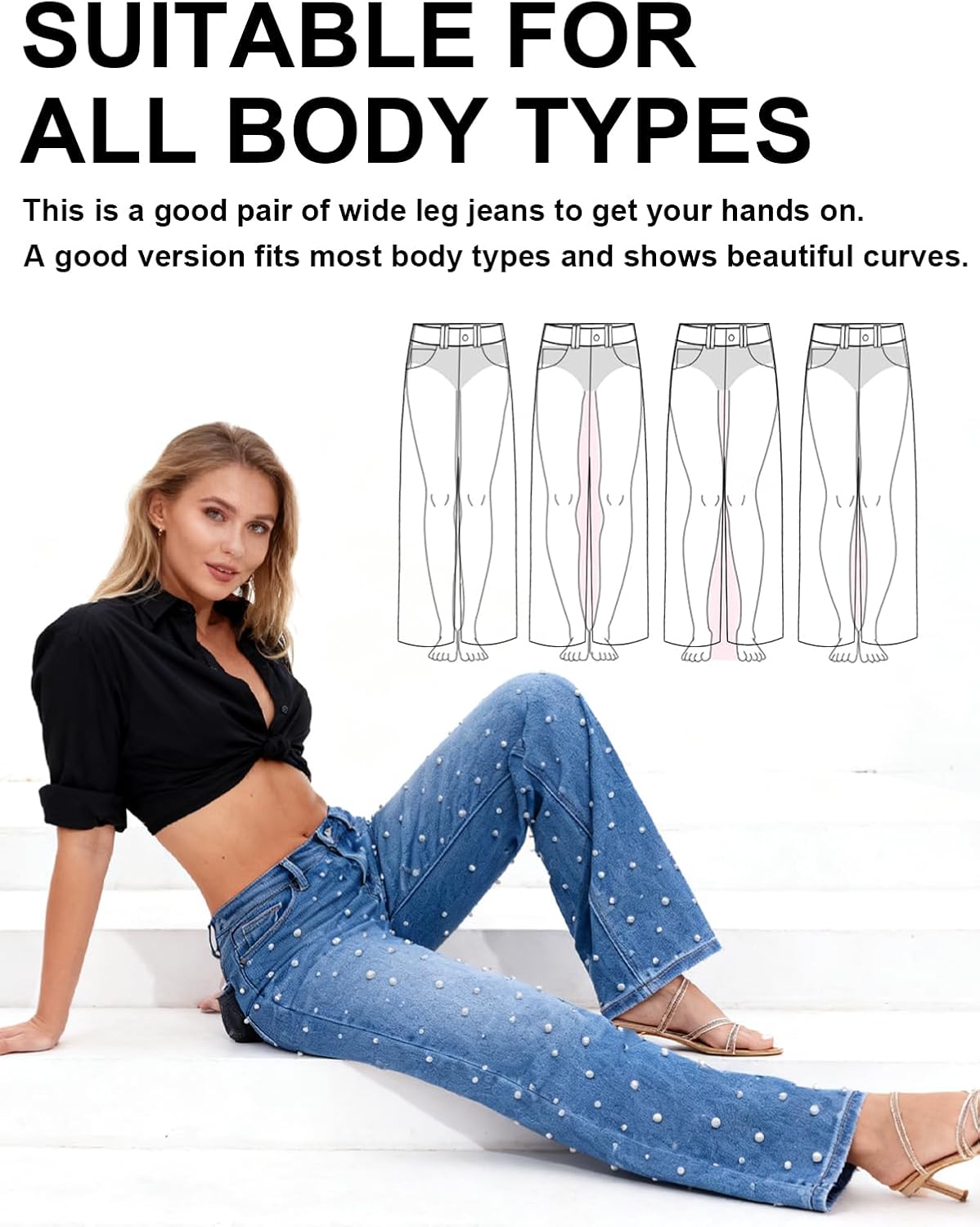 ONESO Mid-Low Rise Baggy Jeans Wide Leg for Women Distressed Pants Stretchy Bottom Lady Basic Comfortable Denim