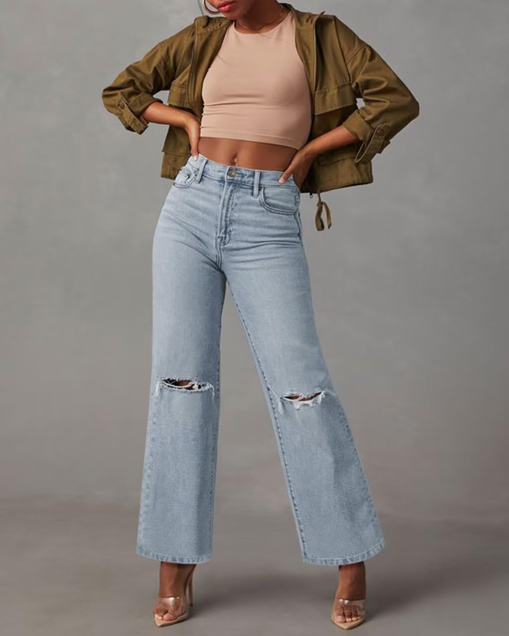 KDF Straight Leg Jeans for Women High Waisted Jeans Frayed Baggy Pants Raw Hem Loose Stretchy Cropped Wide Leg Jeans
