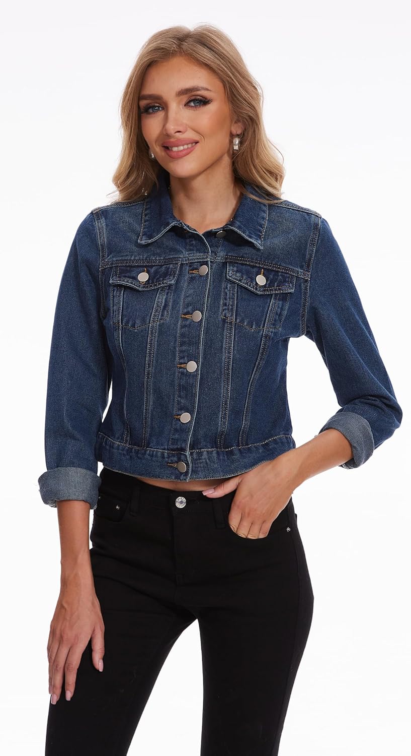 - Constructed with cozy in mind, this women’s jean jackets has a classic fit. Collar, two chest pockets, cropped length, slim-fit cut, button closure.The light denim jacket for women are Non-stretch which is comfortable for everyday wear