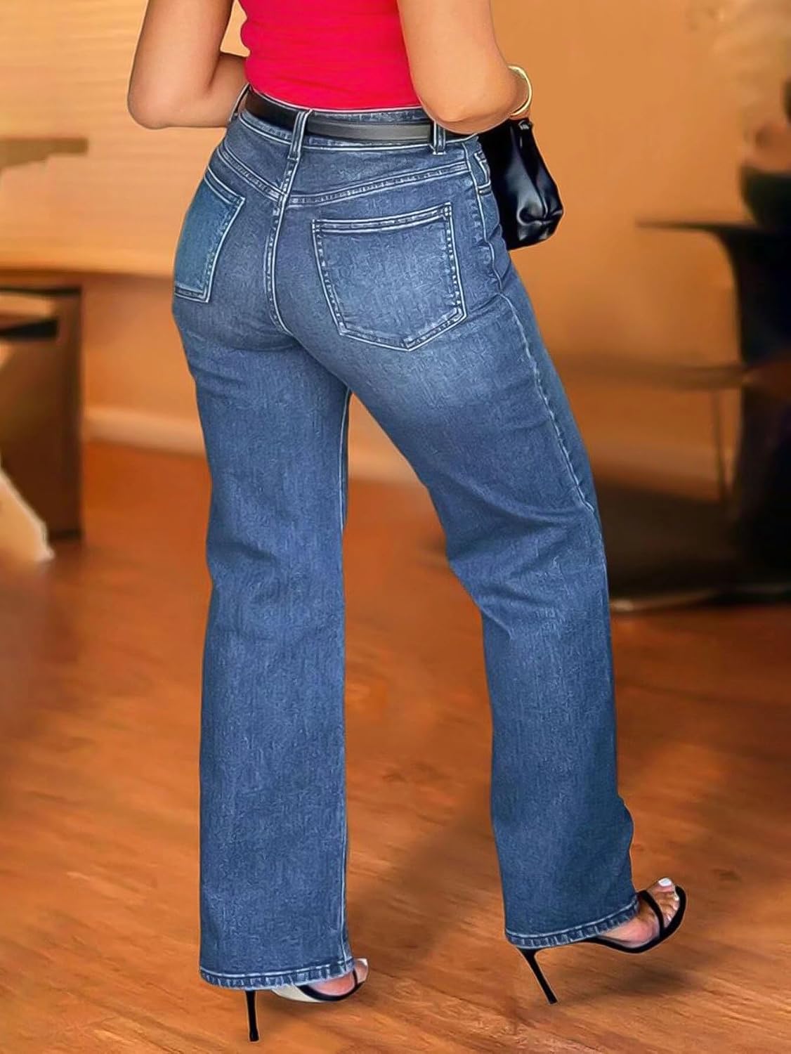 Flamingals Wide Leg Jeans for Women Mid Waist Baggy Stitch Decor Denim Washed Pants Without Belt
