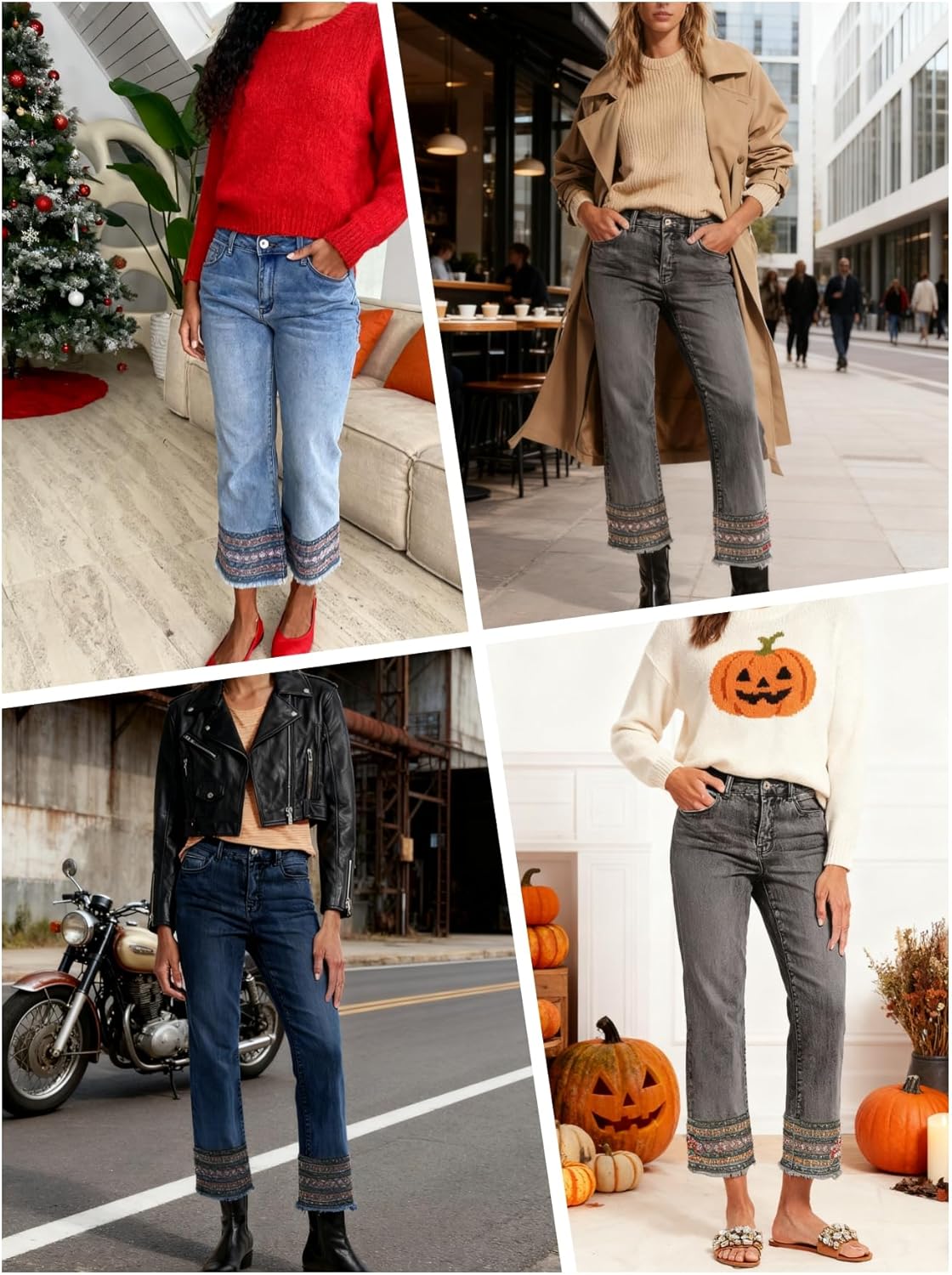 Flamingals Straight Leg Jeans for Women Low Rise Cropped Jeans Wash Embroidery Raw Hem Denim Pants